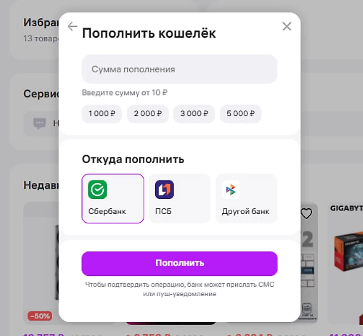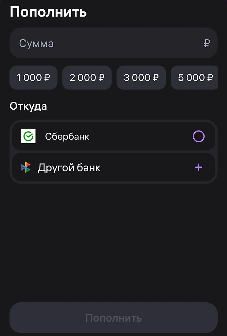 Укажите желаемую сумму для зачисления, выберите банк для списания средств и нажмите «Пополнить».