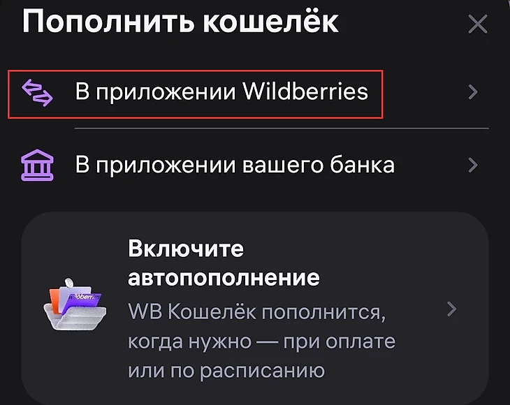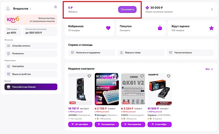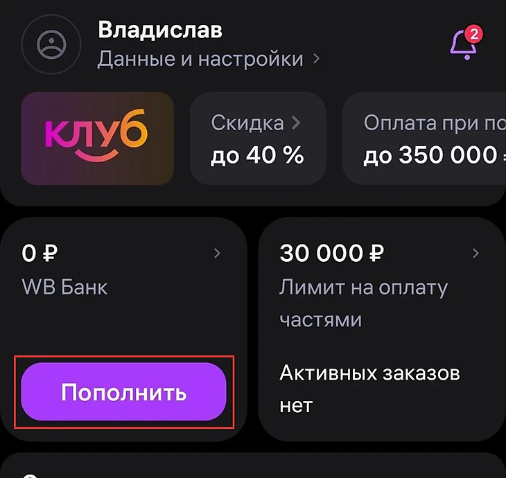 Нажмите кнопку «Пополнить» в разделе «WB Банк».