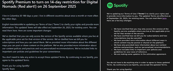 3 сентября в соцсетях завирусилась информация, что слушателям Spotify из других регионов отключат оплаченные премиум-подписки с 26 сентября 2025 года. В оригинальном сообщении автор текста рассказал, что ему пришло письмо от имени сервиса, в котором говорится о требовании подтверждать пребывание в указанном при регистрации регионе каждые 14 дней.