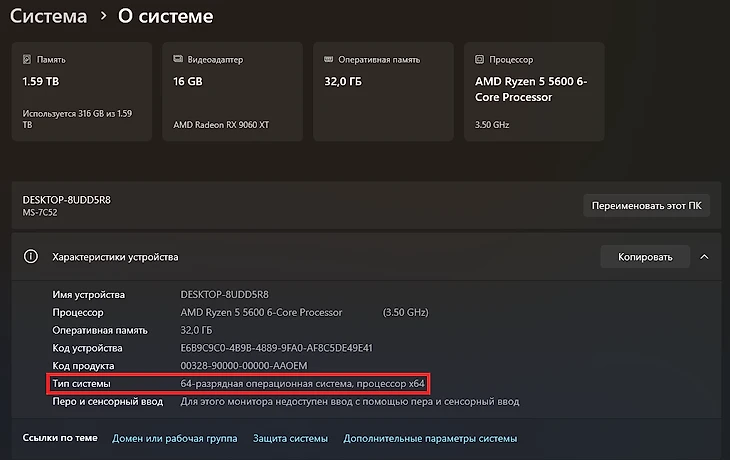 Посмотрите разрядность ОС в разделе «Тип системы».
