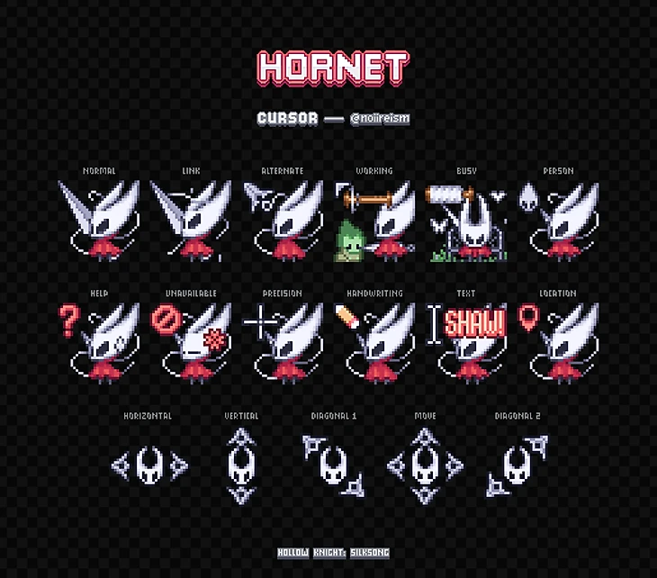 В этом окне вы можете загрузить в систему заранее скачанные из интернета наборы курсоров с расширением .cur или .ani (для анимированных указателей) и превратить курсор из банальной стрелки во что угодно, например, в Хорнет из Hollow Knight Silksong.