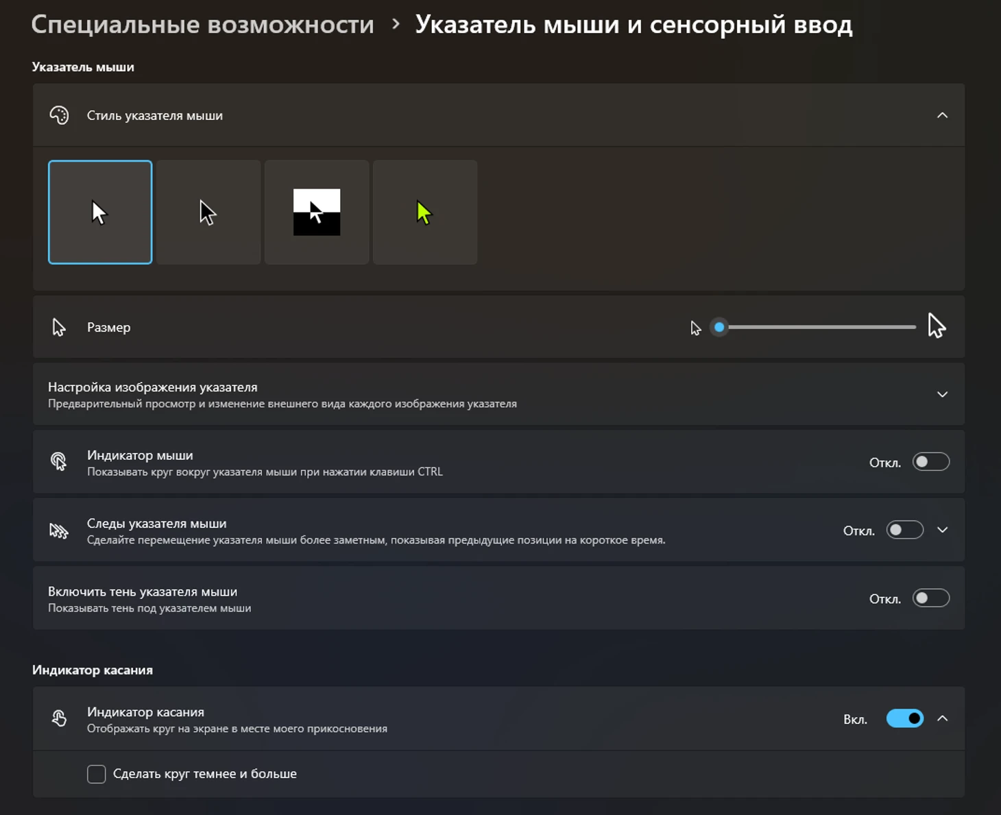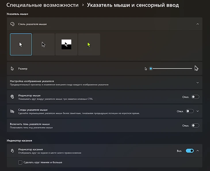 Соответствующая функция находится в том же меню «Специальных возможностей». Помимо классического изменения размера и цвета курсора здесь есть такие опции, как подбор его толщины или отключение отображения этого элемента.