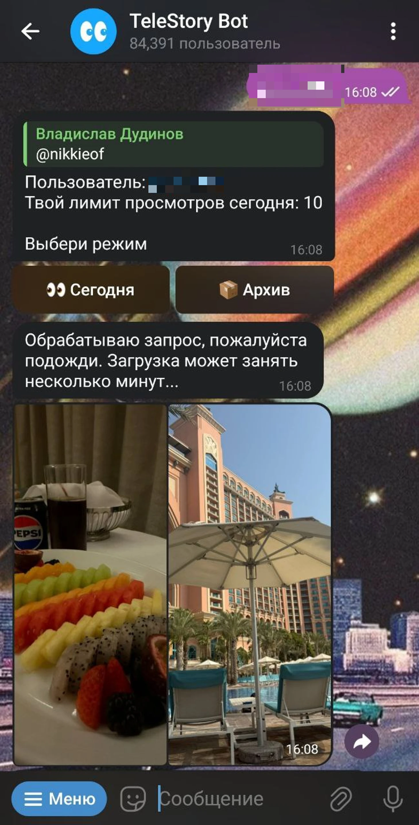 Перейдите в бота и запустите его. После откройте профиль пользователя, чьи истории хотите посмотреть, скопируйте его ссылку и вставьте ее в диалог с ботом. В появившемся меню выберите «Сегодня» или другой нужный день, после чего бот пришлет вам просмотренные истории в виде изображений.