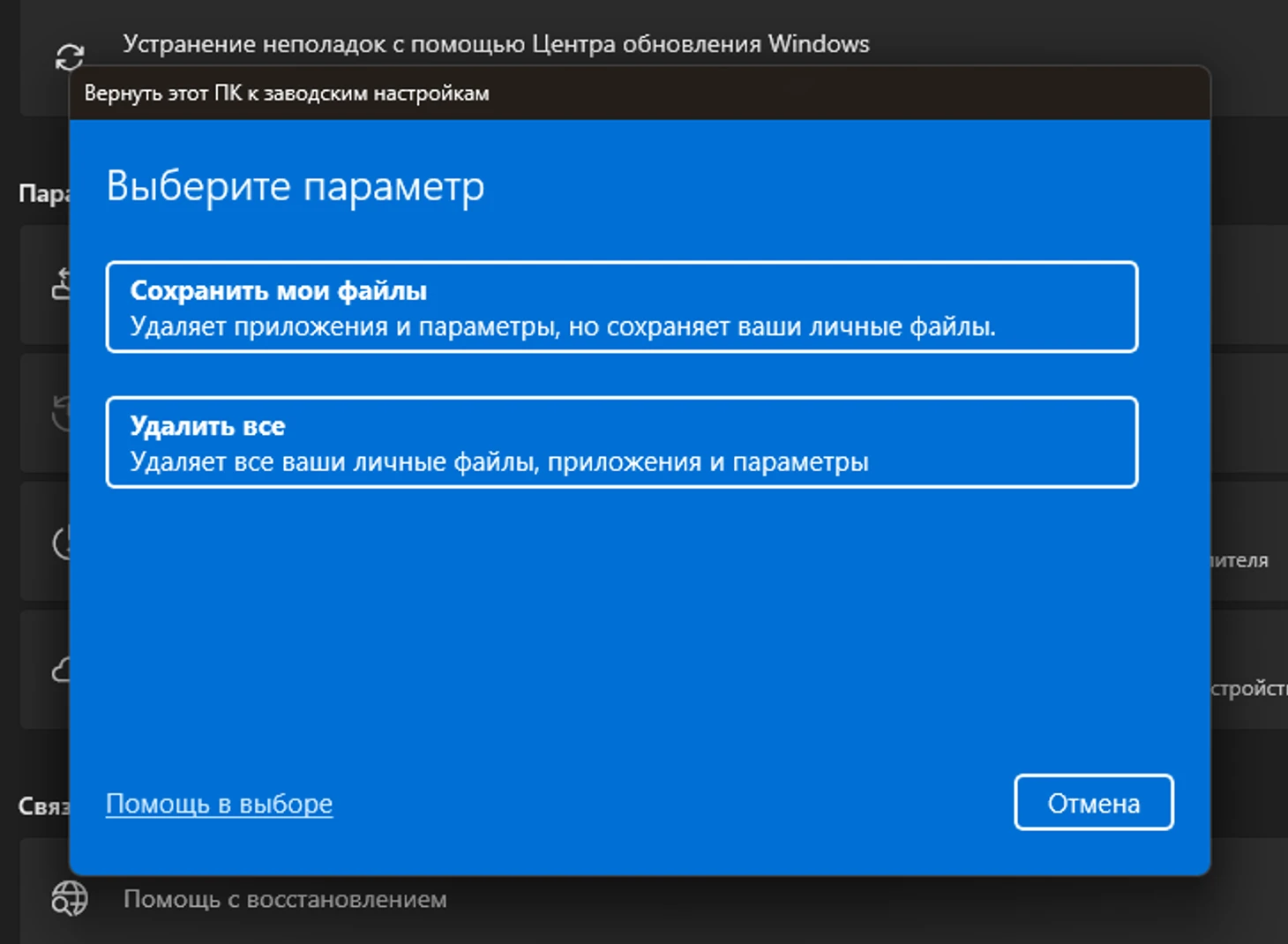 Вы попадете в уже знакомое меню выбора. «Сохранить мои файлы» позволит оставить ваши личные данные, а «Удалить все» полностью очистит диск.