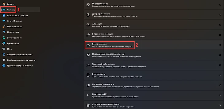 Выберите раздел «Система», а в нем – пункт «Восстановление».