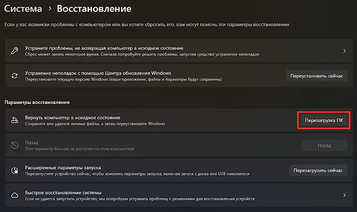 В открывшемся окне найдите раздел «Параметры восстановления» и нажмите кнопку «Перезагрузка ПК» напротив пункта «Вернуть компьютер в исходное состояние».