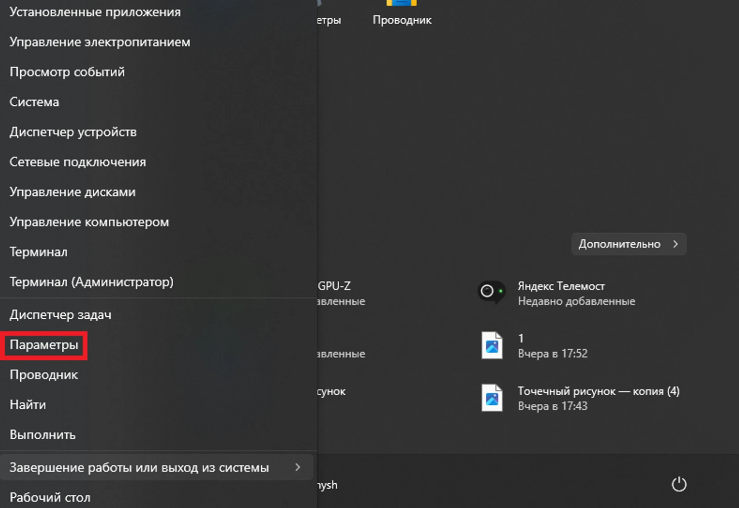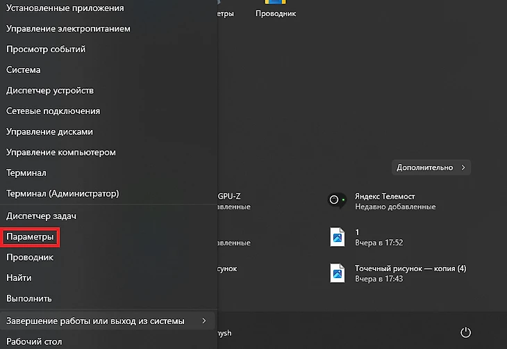 Кликните правой кнопкой мыши по меню «Пуск» и выберите «Параметры» или нажмите сочетание клавиш Win + I.