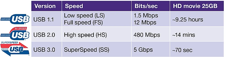 Этот стандарт уже староват, но все еще используется для подключения малотребовательной периферии: клавиатур, мышек, наушников и некоторых других устройств, где высокая скорость не нужна. Скорость этой версии – до 480 Мбит/с.