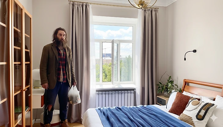 «Add a realistic-looking homeless man into this image. He has long brown hair and a long messy beard, and looks like he hasn’t washed for months. He is wearing ripped tracksuit bottoms, boots, a checked shirt and a brown jacket. He has just walked into the bedroom and is carrying a small plastic bag with random belongings inside».