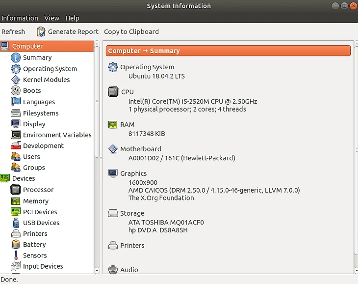 Графическая утилита, которая входит в состав многих дистрибутивов и показывает подробные характеристики в удобном интерфейсе. С ее помощью можно узнать параметры процессора, памяти, видеокарты и подключенных устройств.