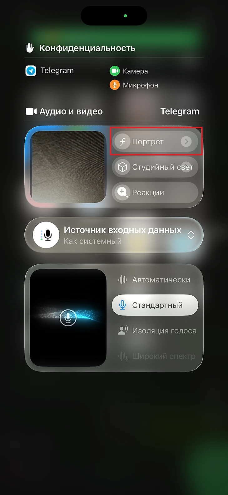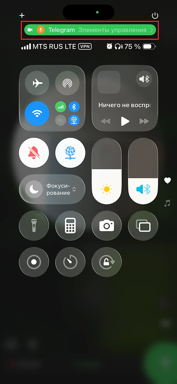 Не прекращая запись, откройте шторку управления. В верхней части экрана вы увидите зеленую полосу с индикатором записи микрофона и камеры. Тапните по ней.