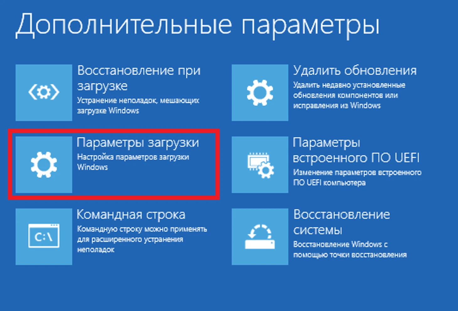После перезагрузки откроется среда восстановления. Дальнейшие шаги аналогичны предыдущим способам: перейдите в «Поиск и устранение неисправностей» «Дополнительные параметры» и «Параметры загрузки» и подтвердите перезагрузку.