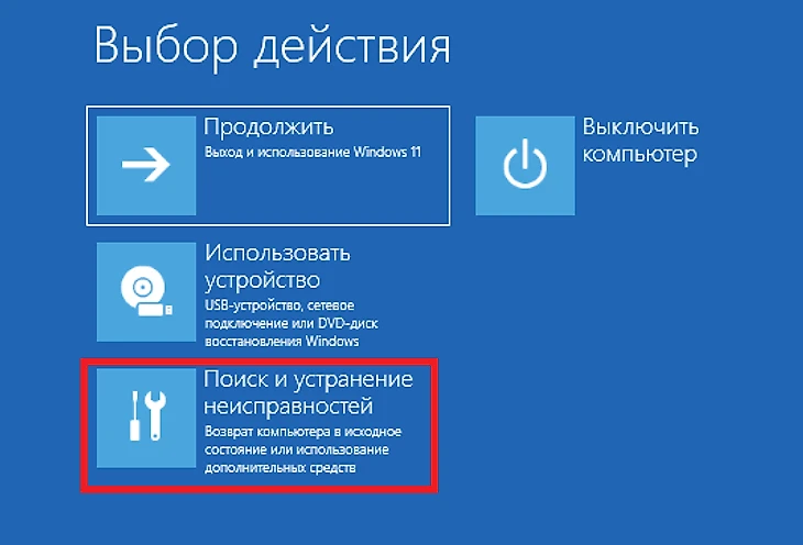После перезагрузки откроется среда восстановления Windows 11. Нажмите «Поиск и устранение неисправностей».
