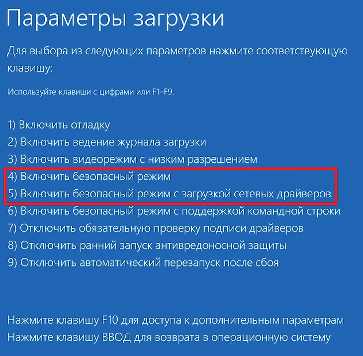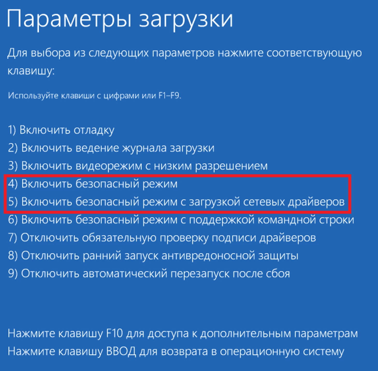 После перезагрузки появится окно выбора режима загрузки. Нажмите клавишу 4 для запуска Windows в безопасном режиме. При необходимости запустить безопасный режим с поддержкой сети используйте клавишу 5.