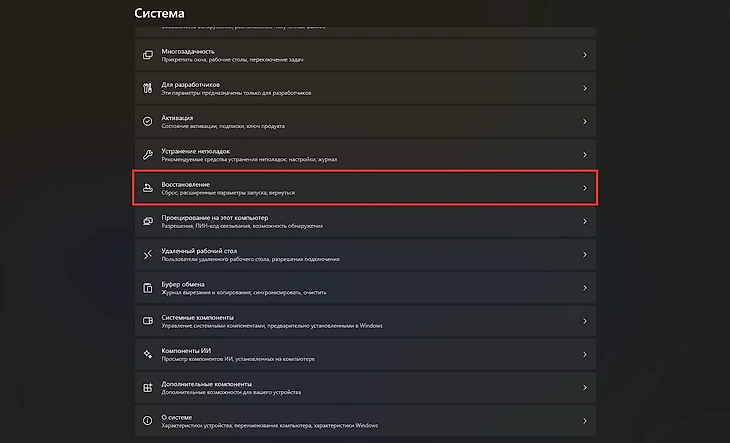 В разделе «Параметры восстановления» в пункте «Расширенные параметры запуска» нажмите кнопку «Перезагрузить сейчас» и подтвердите перезапуск устройства.