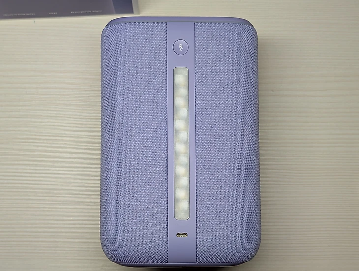 На выбор доступно три цвета: серый, черный и фиолетовый. На колонке нет глянца, Станция выглядит симпатично и по домашнему – впишется в любой интерьер. Акустическая же ткань двухцветного плетения мягкая на ощупь, так что даже держать колонку в руках приятно.