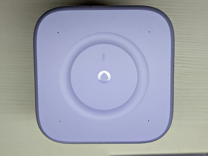 Раз уж речь зашла про управление, то расскажу об остальных «физических» взаимодействиях с колонкой. В центре кольца находится сенсорная кнопка с логотипом Алисы. Нажав на нее, можно прервать ответ голосового ассистента, остановить музыку или запустить ее. Если удерживать палец на логотипе, то Алиса будет готова услышать вопрос к ней.