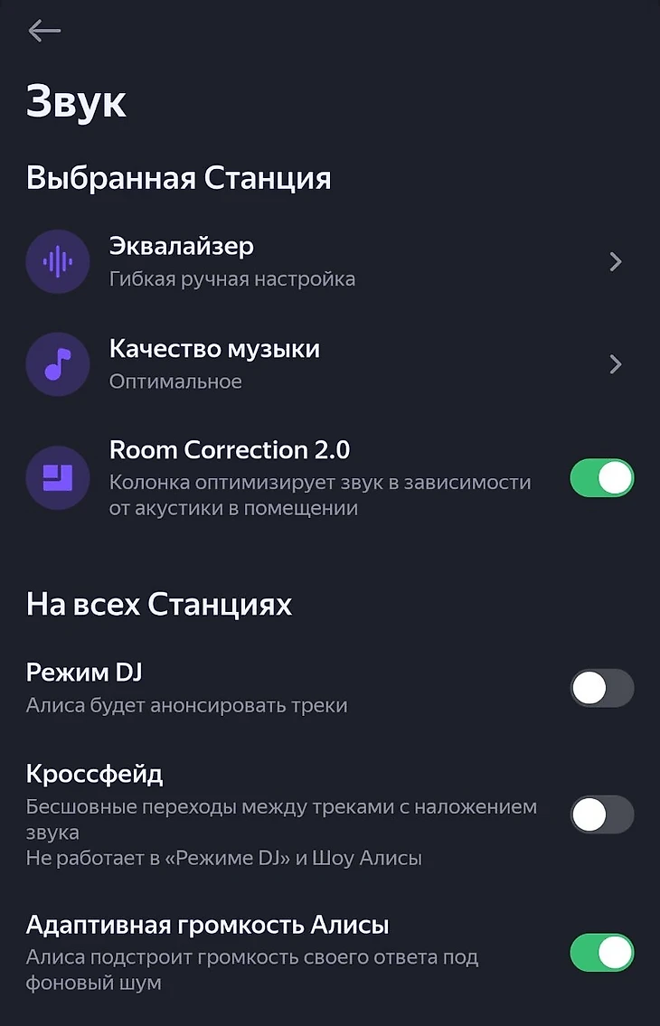 На пользу звучания новой станции также работает функция Room Correction 2.0. По умолчанию фича включена, но при желании ее можно отключить в приложении. Она скрывается в разделе «Звук» под названием «Коррекция под помещение», а обратное включение займет около минуты для повторного подстраивания. Однако вовсе не вижу смысла ее выключать.