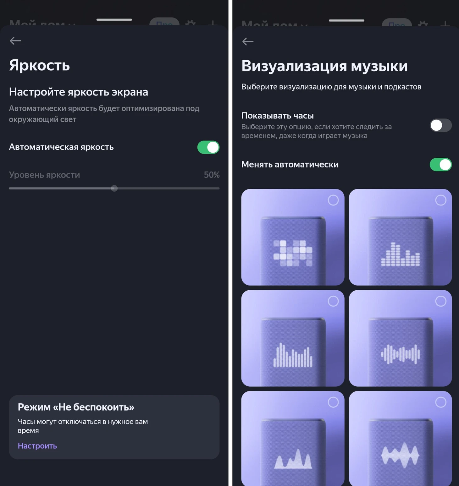 При этом яркость LED-дисплея автоматически меняется в зависимости от освещения в помещении. И, конечно, можно настроить экран под себя в приложении «Дом с Алисой». Тут есть как возможность выбора любимого эквалайзера, так и полное его отключение, вернув часы на привычное место. При желании также можно установить режим «Не беспокоить», чтобы экран полностью выключался в установленное время.