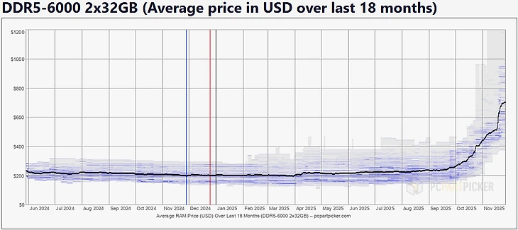 Как менялась стоимость DDR5 за период с июня 2024 по ноябрь 2025 года.