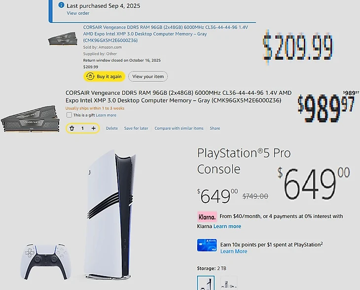 Только вдумайтесь – купить PS5 Pro выйдет дешевле, чем набор плашек ОЗУ на 64/96 ГБ DDR5. Конечно, 96 ГБ памяти излишне для домашней игровой системы, но важен сам факт, что ценник в данном случае вырос почти в 5 раз.
