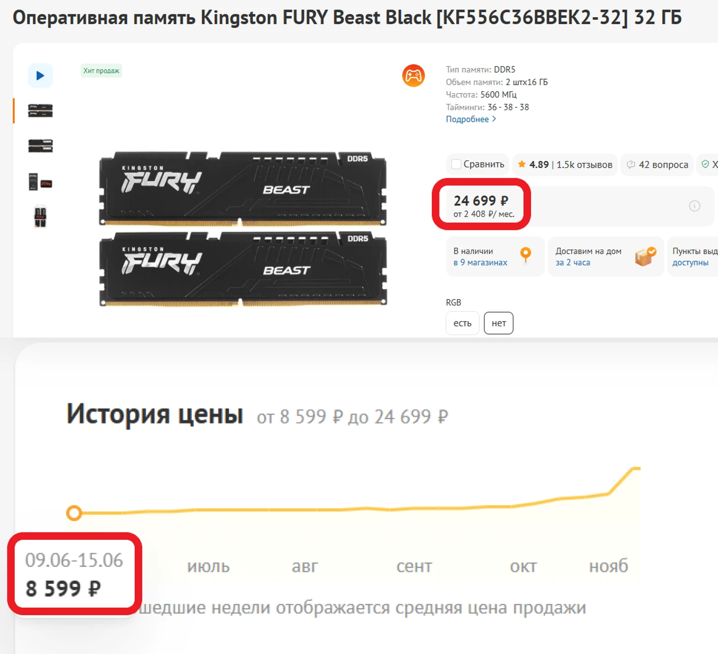 Плохие новости для всех, кто хотел обновить ПК свежей оперативной памятью и ждал выгодных предложений. С начала ноября ценники на оперативку стремительно растут и сейчас набор плашек на 64 ГБ DDR5 стоит на уровне новенькой PS5. И это не эксклюзивная фича для россиян – страдает весь мир. Что происходит, кто виноват и когда упадут цены?
