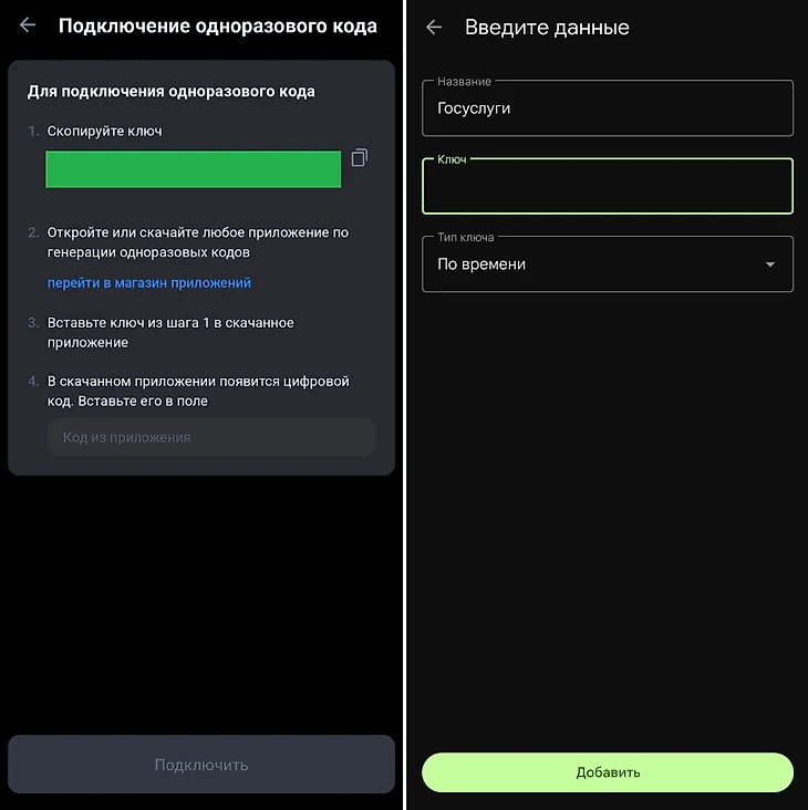 Откройте приложение-аутентификатор и вставьте ключ из Госуслуг. После добавления ключа на главном экране приложения выведется строчка с шестизначным кодом – введите его в соответствующее поле Госуслуг.
