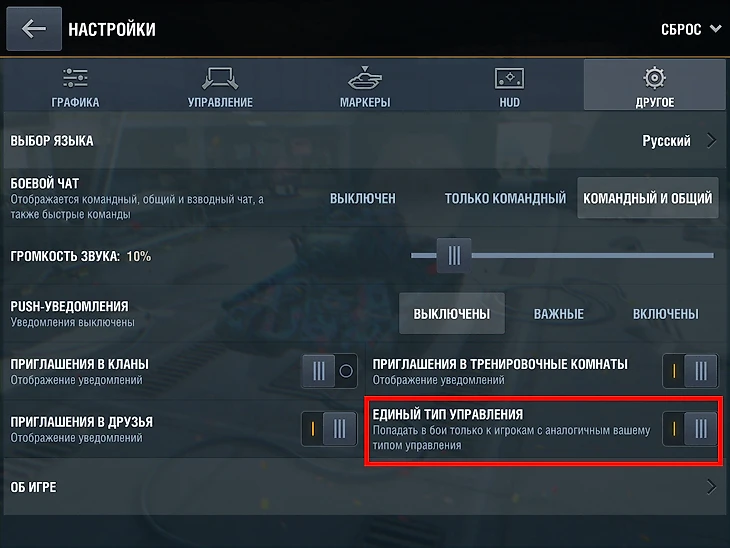Даже не стоит говорить про топовый девайс и интернет. Без них ничего не получится. Поговорим прежде всего о хитрых настройках в самой игре. Если играете на планшете (а именно на нем и нужно играть), сразу же включаем галочку «единый тип управления». Если играете с ПК, нужно наоборот отключать эту галочку. В наш бой должны залетать «сенсорные» игроки. На сенсоре чаще встречаются ребята со слабыми устройствами, у которых лагает интернет и проседает FPS. Они – источник халявного урона. В целом, на ПК играть ничуть не легче, но средний уровень игры у ПК-шников выше, чем у сенсорников, так как все или почти все ПК тянут Blitz.