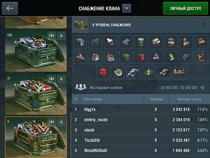 В клане можно экономить серебро с самого начала игры. Даже несколько сотен серебра за бой на дистанции выльются в миллионы. Лучше сразу выбрать клан с десятым уровнем кланового снабжения. Для новичка он не будет доступен сразу, но по мере прокачивания личного доступа скидки на танки, снаряжение, амуницию будут нарастать.